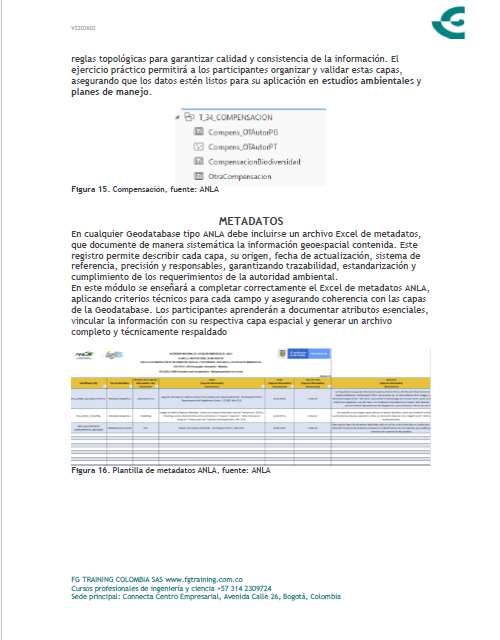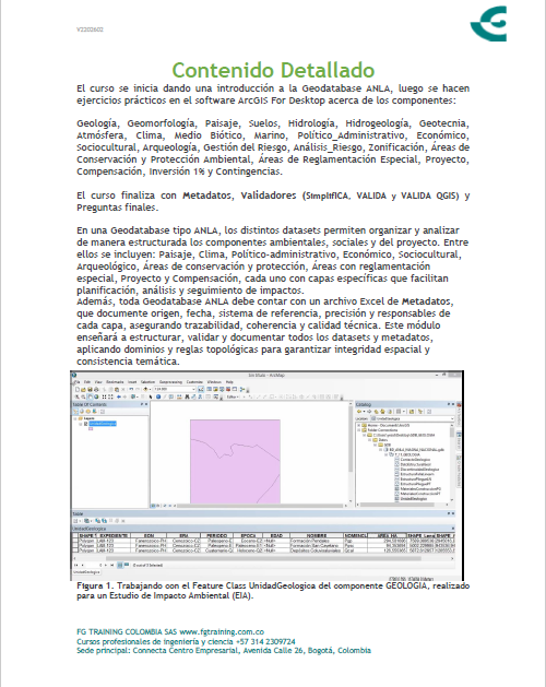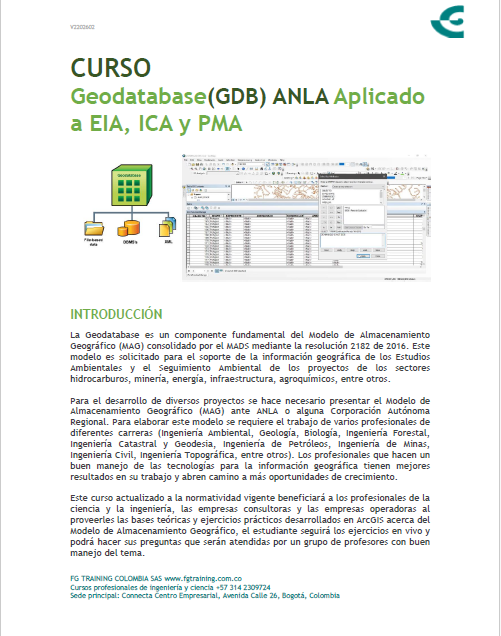 Es importante tomar este curso ya que en Colombia hay miles de proyectos que requieren entrega de GDB ANLA. Los sectores en donde puedes trabajar son: Hidrocarburos, Minería, Infraestructura, Energía y Agroquímicos. En este curso te enseñamos paso a paso cómo diligenciar de manera correcta una Geodatabase (GDB) ANLA. Se trabajará GDB EIA, GDB PMA y GDB ICA. Además enseñaremos cómo hacer los Metadatos según la última Plantilla de Metadatos ANLA. Y por último explicaremos cómo trabajar con el software de ANLA «VALIDA QGIS», el cual fue lanzado en Noviembre 2025.